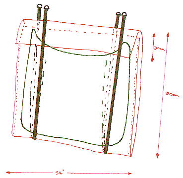 Hardtop Storage BagSo far I've bought three fabrics; a water/dust proof nylon layer, a one inch thick padding layer and a soft cotton/nylon liner to stop the catches and edges ripping the padding. You could just use two if you can find a suitable quilted, padding material but, with three layers it's easier to hide the edges. Each piece is 3m long by about 54" wide. You will also need 6m of nylon strapping (>1" wide, as used on rucksacks, etc.) and four D-hooks to fix to the strapping. The common materials were bought from a fabric warehouse but the specialist materials were bought from Pennine Outdoor (Tel. 01484 689100), an outdoor material and accessory specialist supplier. Total materials cost was less than £30. A good place to buy these sorts of materials from is Pennine OutdoorThe hardtop costs nearly £1250 and weighs 10.5Kg so I'm over engineering the supporting straps, just in case. The design has two folds for the front, back and lid. The bag is held to the wall with the nylon strapping which loops down the back of the bag and up the front to form four ends with D-loops for two hanging points. The bag will protect the roof and the nylon straps will take the weight. A strip of velcro will hold the lid/flap in place to keep out the dust. I've also added a couple of pockets for the clamping bar and the bolts. It will look something like this (hardtop outlined in green):